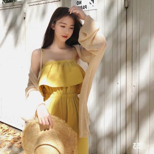 [XBI5I18P]옐로우 원피스 끈나시 하객룩 점프슈트 레이