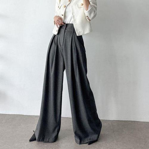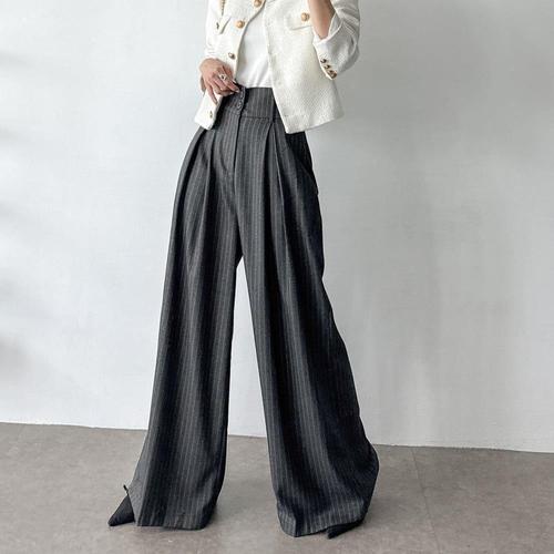 [옷자락] 여자 맥시 와이드 투버튼 하이웨스트 줄무늬 슬랙스