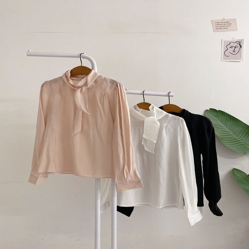 [옷자락]여자 겨울하객룩 하이넥 리본 타이 퍼프 블라우스