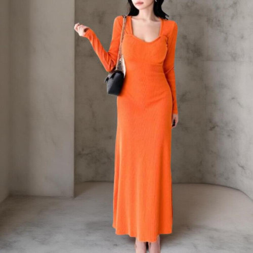 [옷자락]여성 심플 슬림핏 하트넥 골지 긴소매 롱 드레스