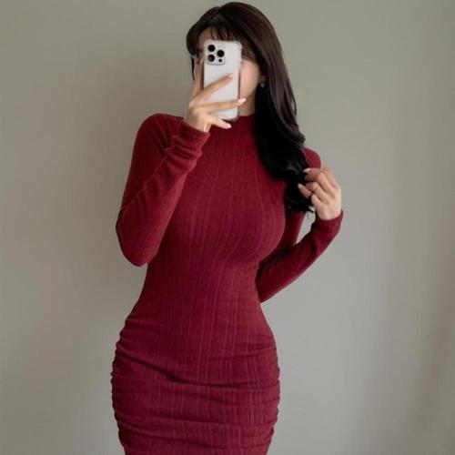 [옷자락]여자 사이드 셔링 하프넥 워머 스타일 소매 원피스