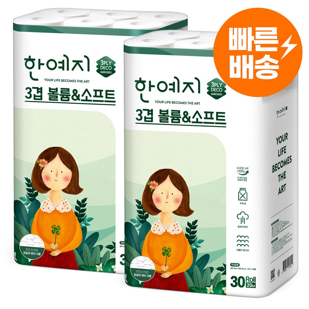한예지 볼륨앤소프트 천연펄프 100% 화장지 3겹 20m 30롤 2팩