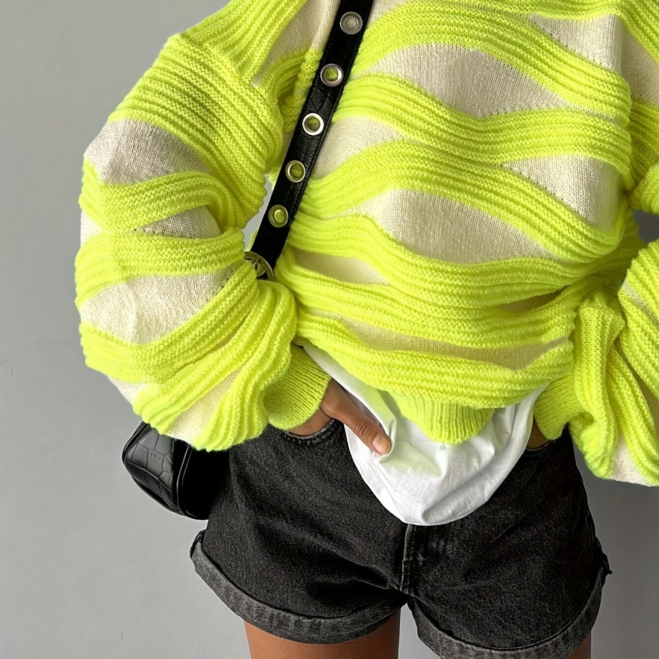 TEMU 특정 스타일 - 라운드넥 웨이브 컬러 블록 긴팔 스웨터 여성 탑 패셔너블 루즈핏 편안한 도파민 랜턴 슬리브 풀오버 스웨터 신상 가을 옐로우 탑