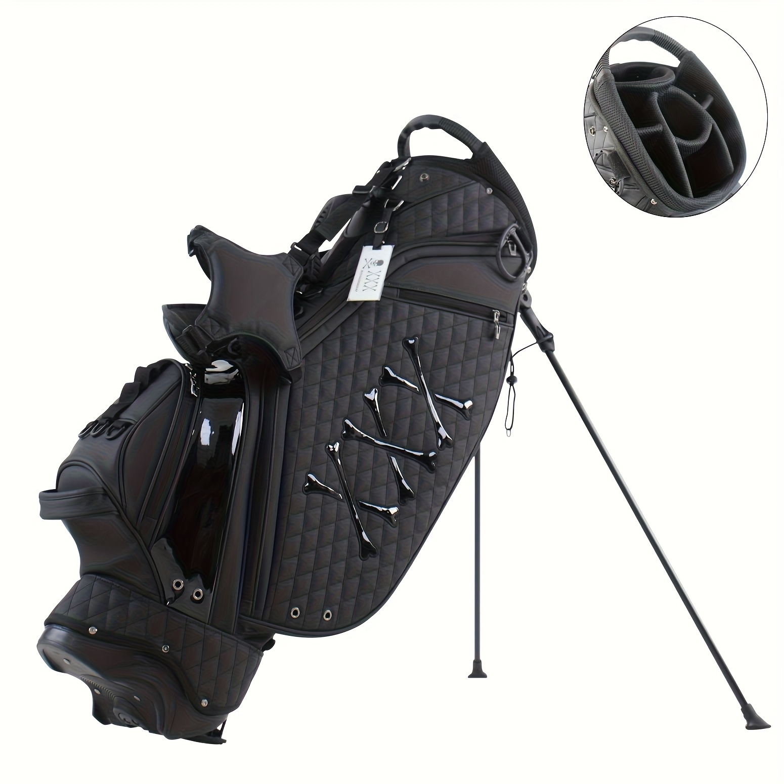 TEMU 조절 가능한 듀얼 숄더 스트랩 골프 스탠드 백 - 7개의 분할 공간 & 5개의 지퍼 포켓, 패턴 블랙 마감의 PU 소재, 인체공학적 헤드레스트 & 컴팩트 스탠드 - 남녀공용 디자인, 그립 강화 기어