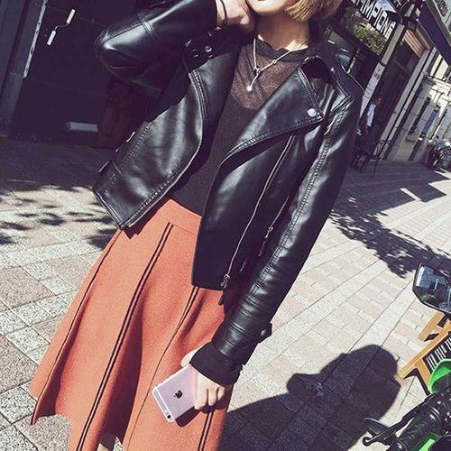 [에이치플러스몰]여자 해외 여행 공항 패션 레더 검정 가죽 자켓 코디
