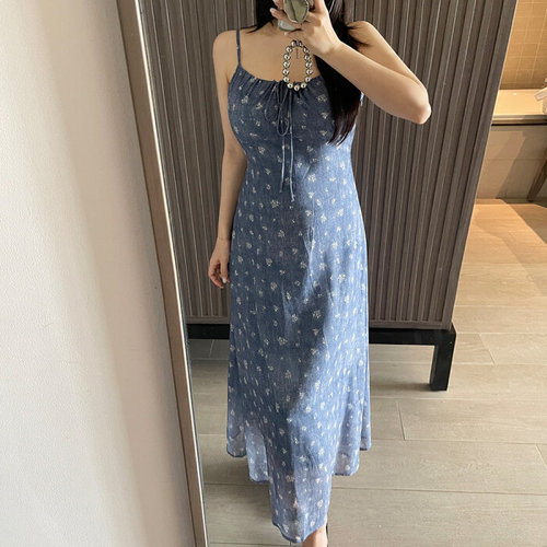 글램핏 / 해외여행 바캉스 비치 휴양지 룩 플라워 스트링 셔링 데님 끈 나시 롱 원피