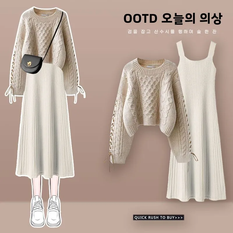 플러스 사이즈 가을 겨울 니트 스웨터 드레스 세트 여성 고급 패션 슬리밍 투피스 수트 출퇴근 스타일 긴팔 라운드넥