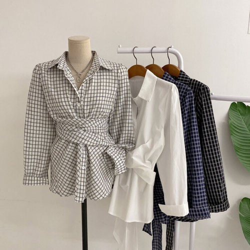허니제이 / 이본느 체크 무지 언발 꼬임 랩 셔츠(4color)