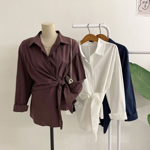 허니제이 / 베어로 꼬임 셔링 리본 랩 코튼 셔츠(3color)