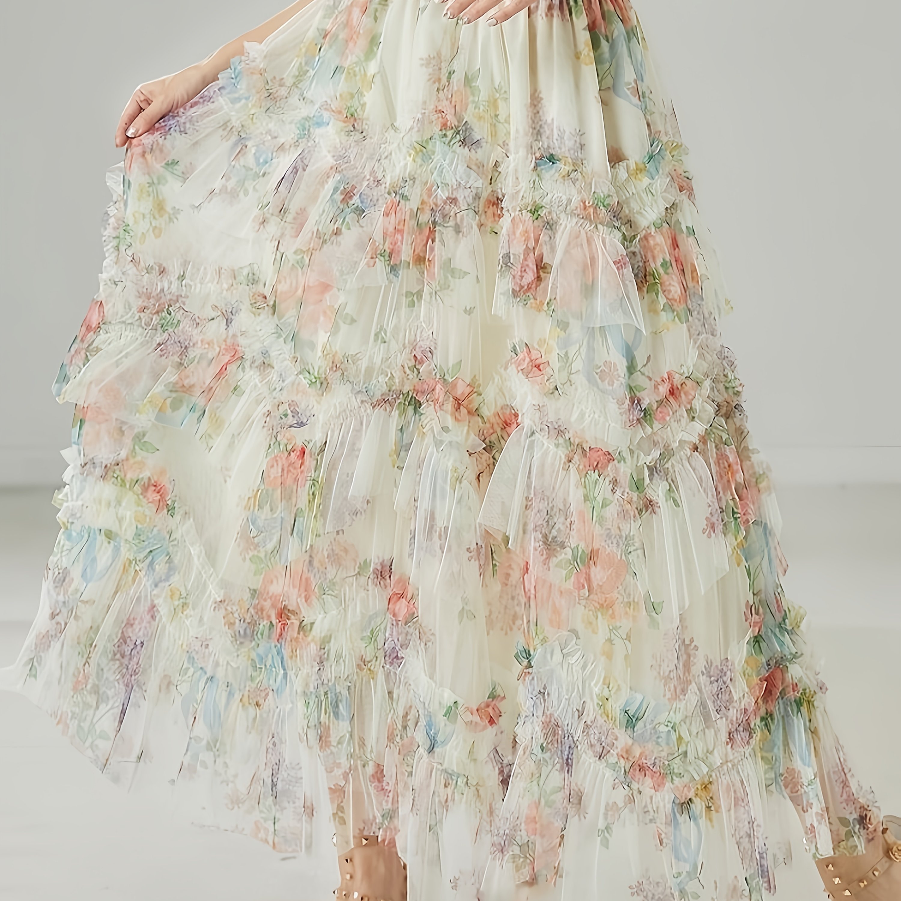 TEMU 꽃무늬와 러플 헴이 있는 우아한 플러스 사이즈 튤 미디 스커트 - 하이 웨이스트, 신축성이 없는, 기계 세척 가능 - 캐주얼하고 공식적인 행사에 적합한 다목적 올 시즌 A 라인 스커트, 플레어 헴, A 라인 스커트
