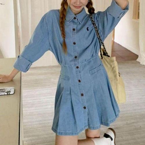 [에이치플러스몰]데님 베이직 카라 원피스 A라인 올데이 스커트 허리밴