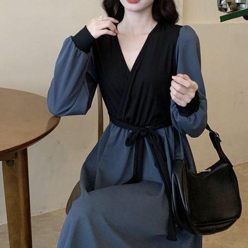 [에이치플러스몰]여성 허리 끈 디자인 블루 배색 A라인 원피스 롱원피스 캐주얼원피스 가을원피스 A라인..