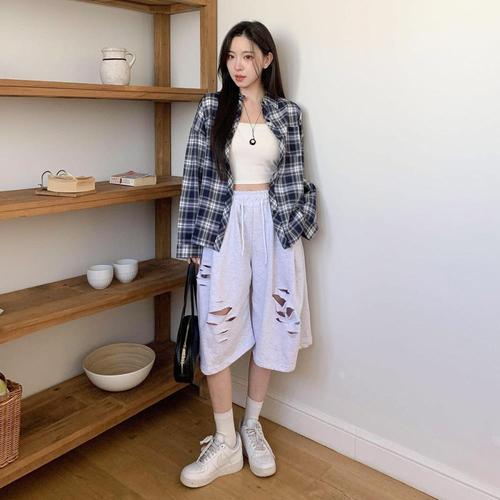 [옷자락] 여자 면혼방 루즈핏 와이드 데미지 허리밴딩 트레이닝 반바지