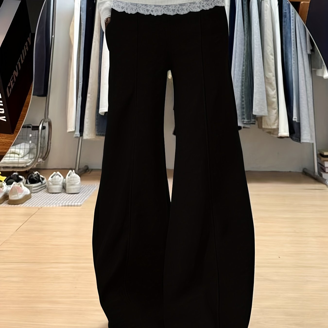 TEMU 레이스 패치워크 하이웨이스트 캐주얼 루즈핏 바지, 포켓 디자인, 편안하고 활용도 높은 여성용 릴렉스 슬라이트 플레어 트라우저.
