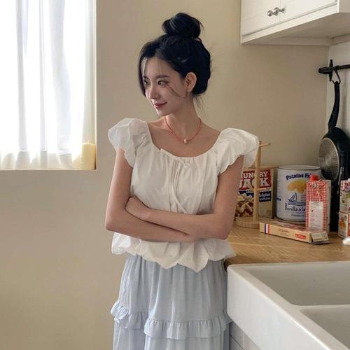 옷자락 / 여성 봄여름 시원한 리본 퍼프 크롭 셔츠