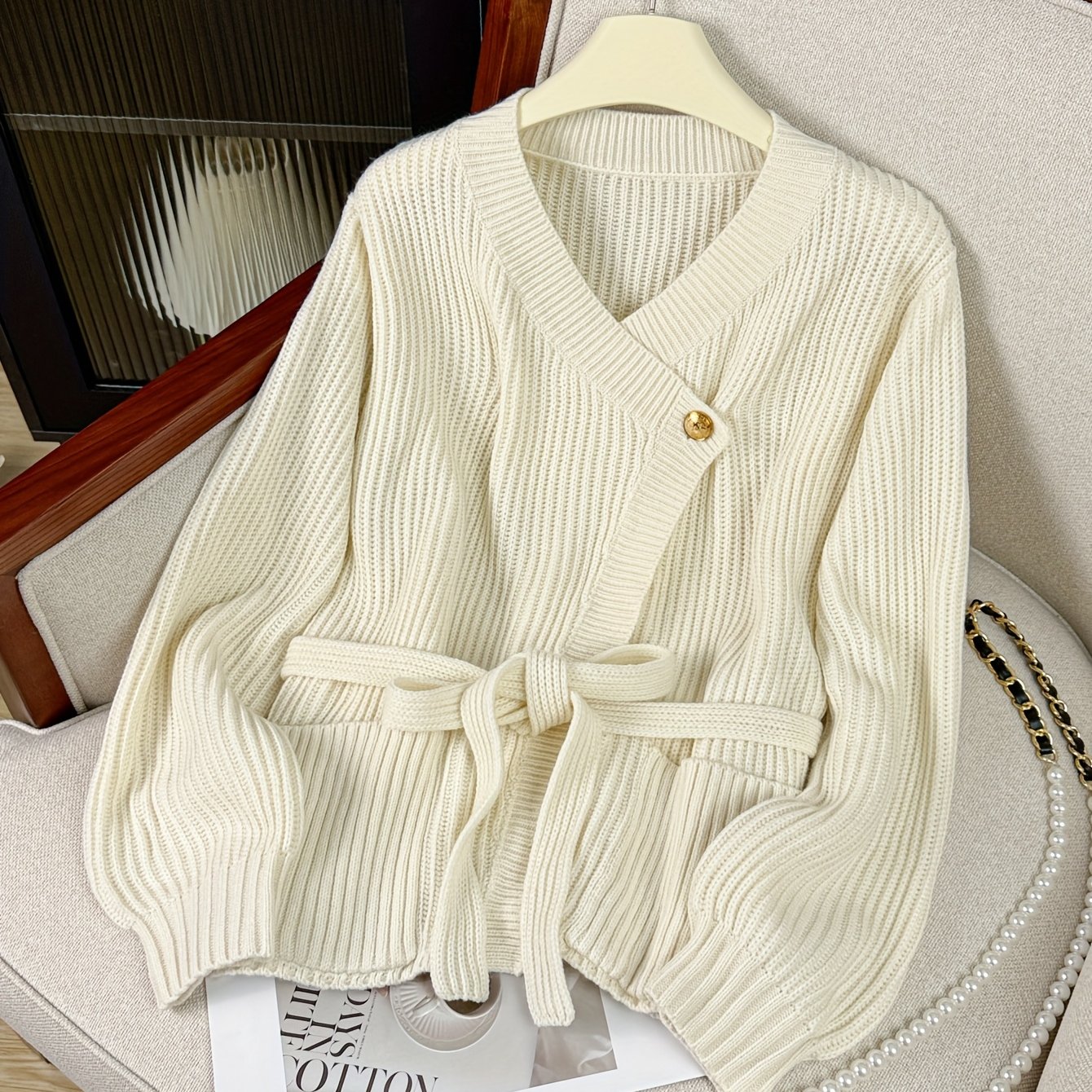 TEMU 여성용 라운드넥 웨이스트 타이 가디건, 가을/겨울 시즌에 완벽하며, 세련되고 성숙한 매력을 발산합니다.