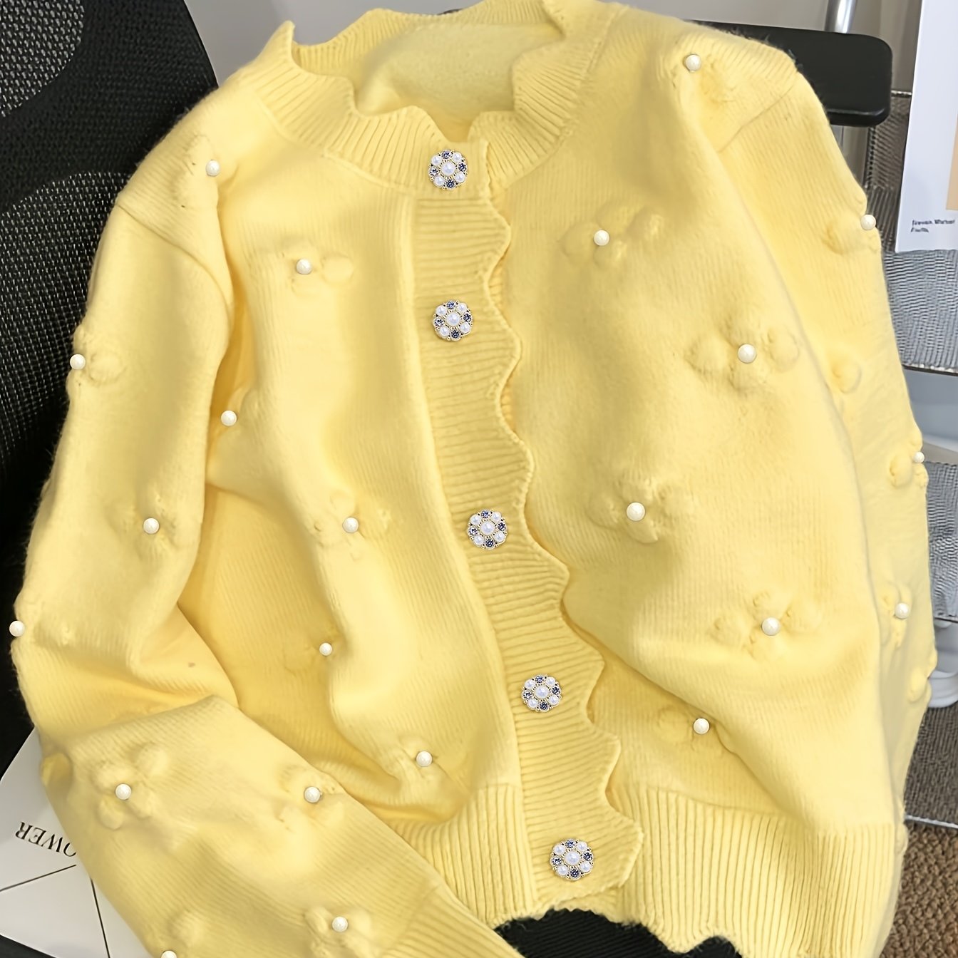 TEMU 여성 캐주얼 우아한 진주 장식 버튼 가디건 | 크루넥, 긴소매, 신축성 좋은 스웨터, 단색, 가을/겨울 레이어링 필수템