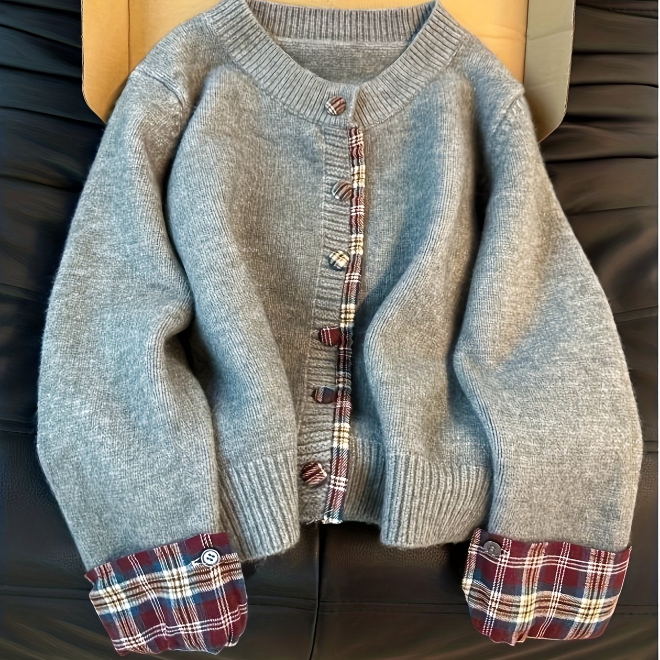 TEMU 여성 캐주얼 버튼 프론트 가디건 - 긴소매, 라운드넥, 체크 패턴, 루즈핏, 단색, 가을/겨울 컬렉션, 캐주얼 아우터, 캐주얼 웨어