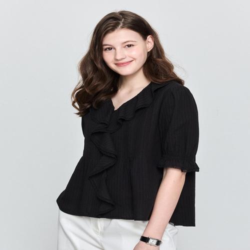 헤지스 여성 [시즌오프][CITY ESSENTIAL] 블랙 러플장식 면혼방 반팔셔츠 (HSSH5BP32BK)