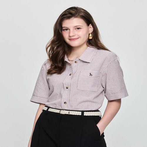 헤지스 여성 브라운 스트라이프 면 반팔셔츠 (HSSH5B413W2)