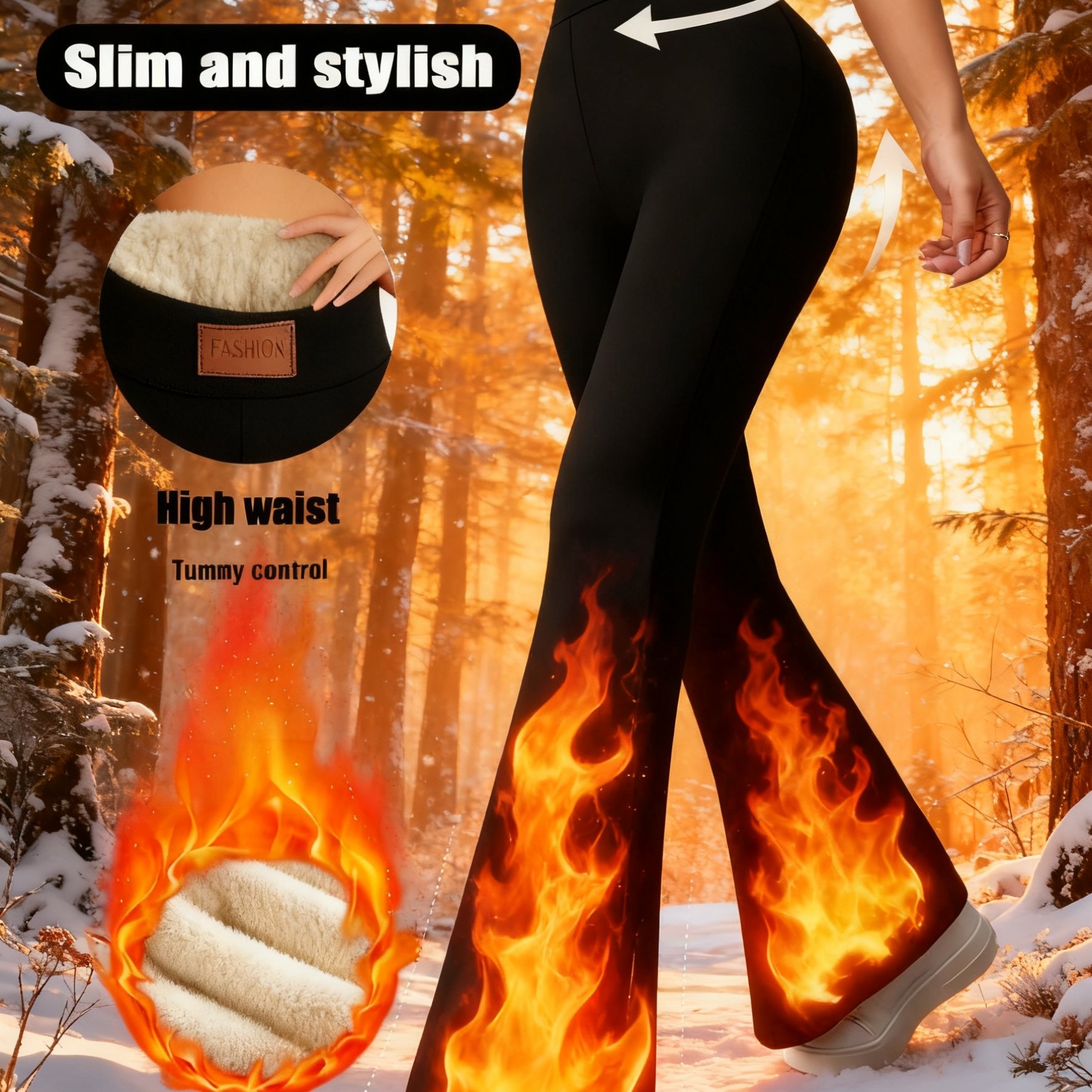 TEMU 여성용 캐주얼 데일리 다용도 스키니 플리스 안감 하이웨이스트 플레어 팬츠, 신축성 허리, 블랙, 겨울용