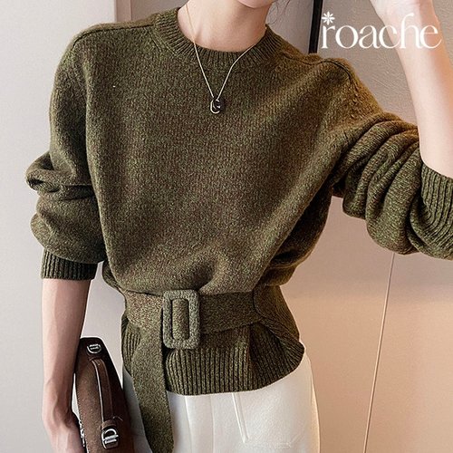 [헬렌]로아체 벨티드 니트 벨트 라운드넥 스웨터 카키 가을