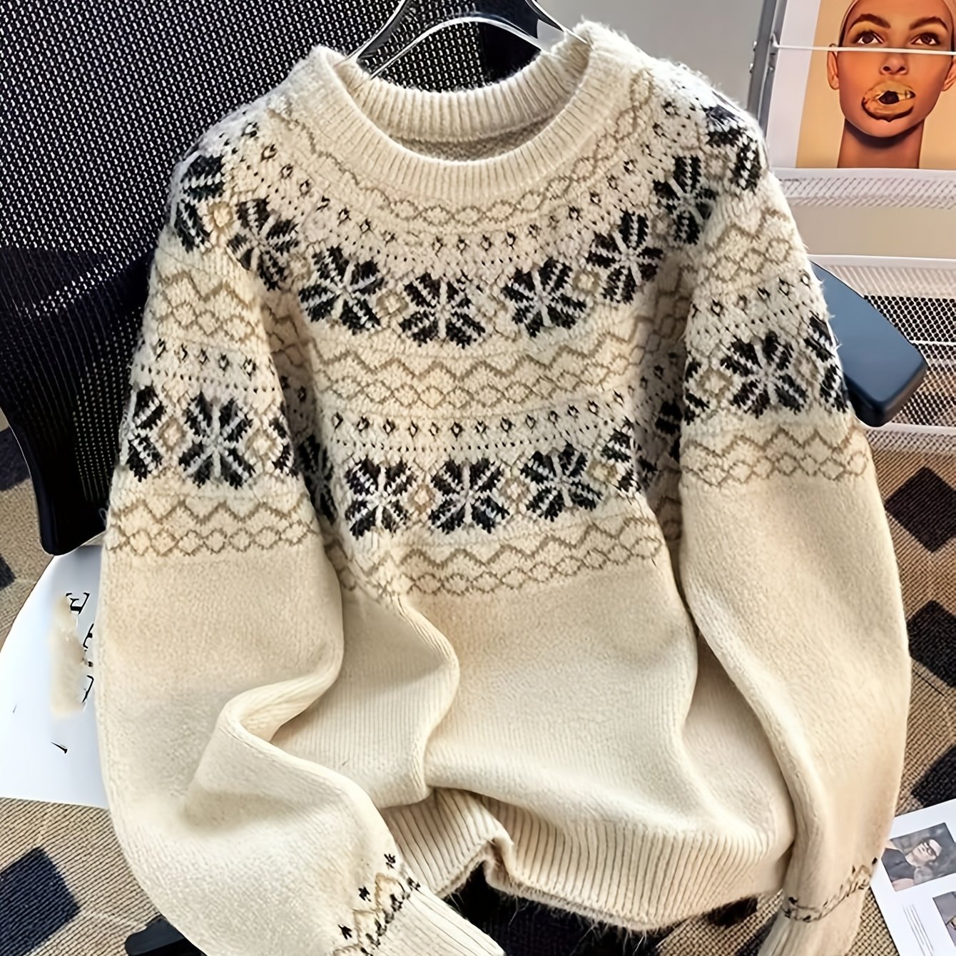 TEMU 레트로 일본 스타일 여성용 루즈 스웨터, 2025년 신상 가을/겨울 컬렉션, 패턴 및 라운드넥 특징.