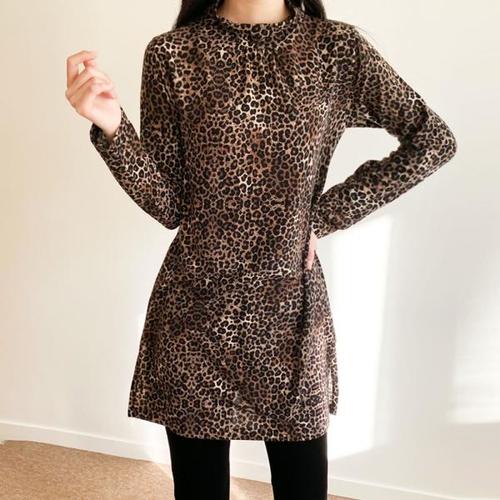 [까르죠아]네크 셔링 반 폴라 호피 롱 블라우스 가을 겨울 빅사이즈 여성 티셔츠