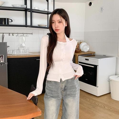 [다잇템]여성 코디 홀터네크 롱슬리브 옆면 크롭탑