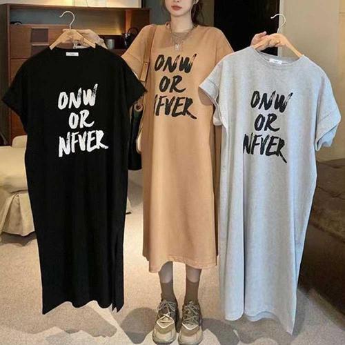 [오너클랜]인기상품 밑단트임 반팔 롱원피스 레터링 프린팅 나들이 홈웨어 [WFC9F38_260404]