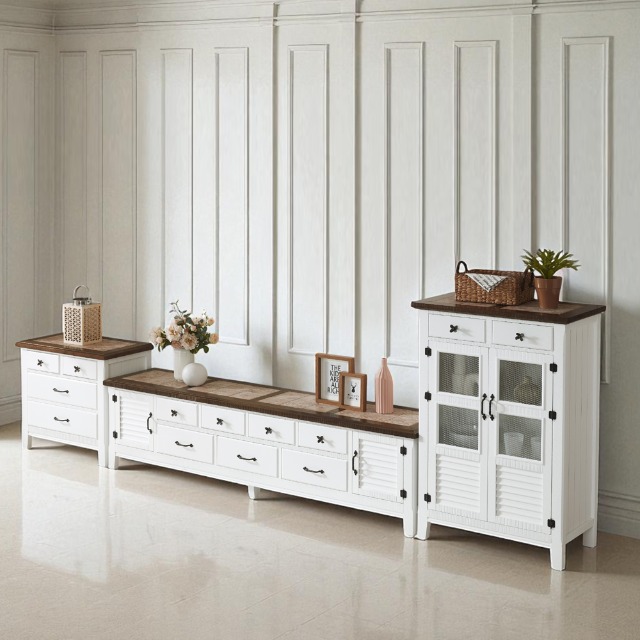 [벤티스가구]엔틱 화이트 유리 장식장 원목 진열장 양주 술 위스키 수납장 낮은 인테리어 가구 3단