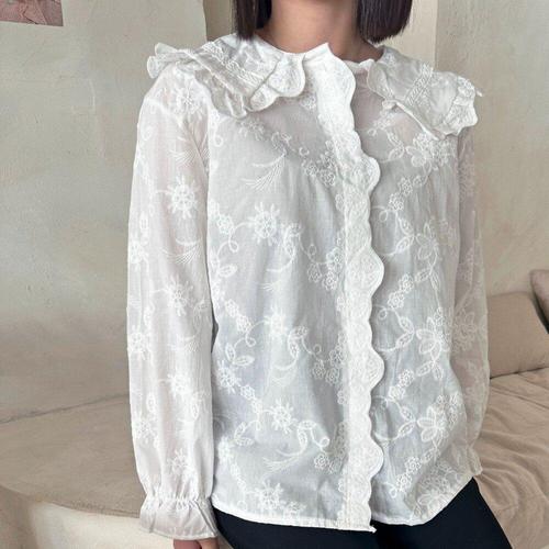 [신상오픈런]여성 프릴 카라 물결 꽃 자수 화이트 블라우스