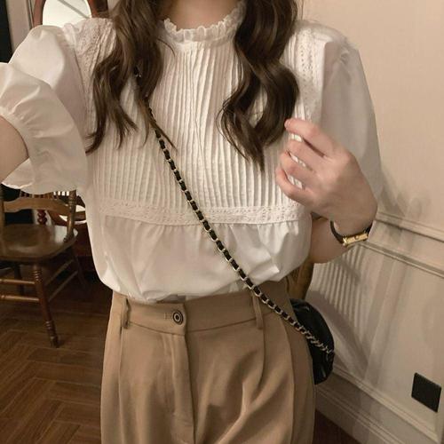 [옷자락] 여성 화이트 레이스 자수 브이넥 반팔 블라우스