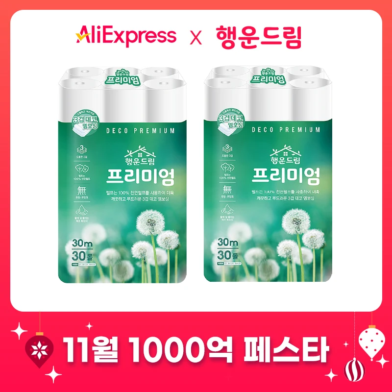 ★판매1위★ 100% 천.연.펄.프 행운드림 프리미엄 3겹 30m 2팩 화장지 휴지 비데겸용 두루마리
