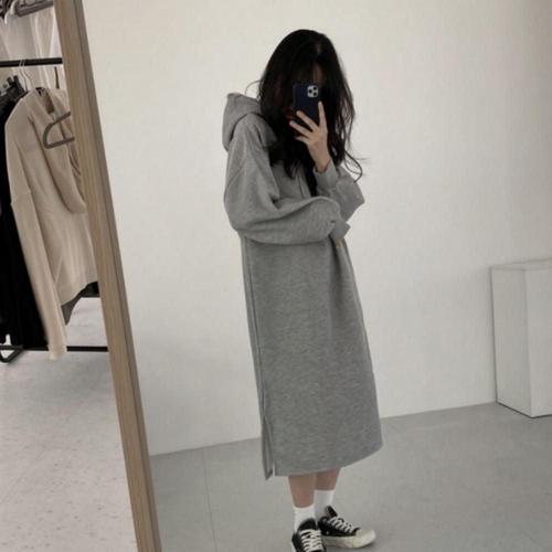 AOKADA 오버핏 롱 후드 맨투맨 기모 원피스 여성 가을 겨울
