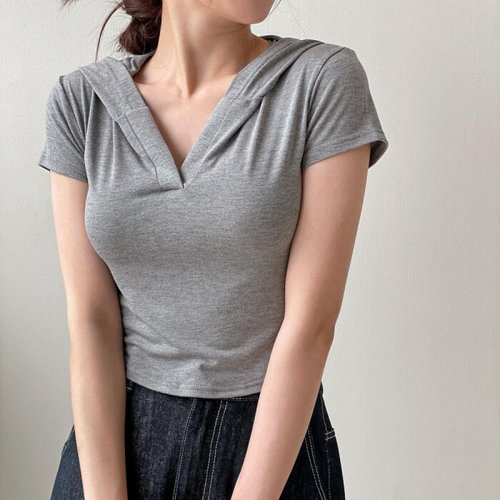 옷자락 / 여자 여름 크롭후드티 브이 굴림 슬림핏 반팔 티셔츠