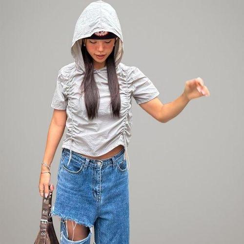 [옷자락]여자 여름 나일론 스트링 셔링 크롭 후드 반팔 티셔츠