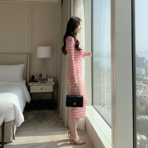 BLACK K7 슬림핏 스트라이프 후드 원피스 여자 데일리 긴팔 이너 롱스커트