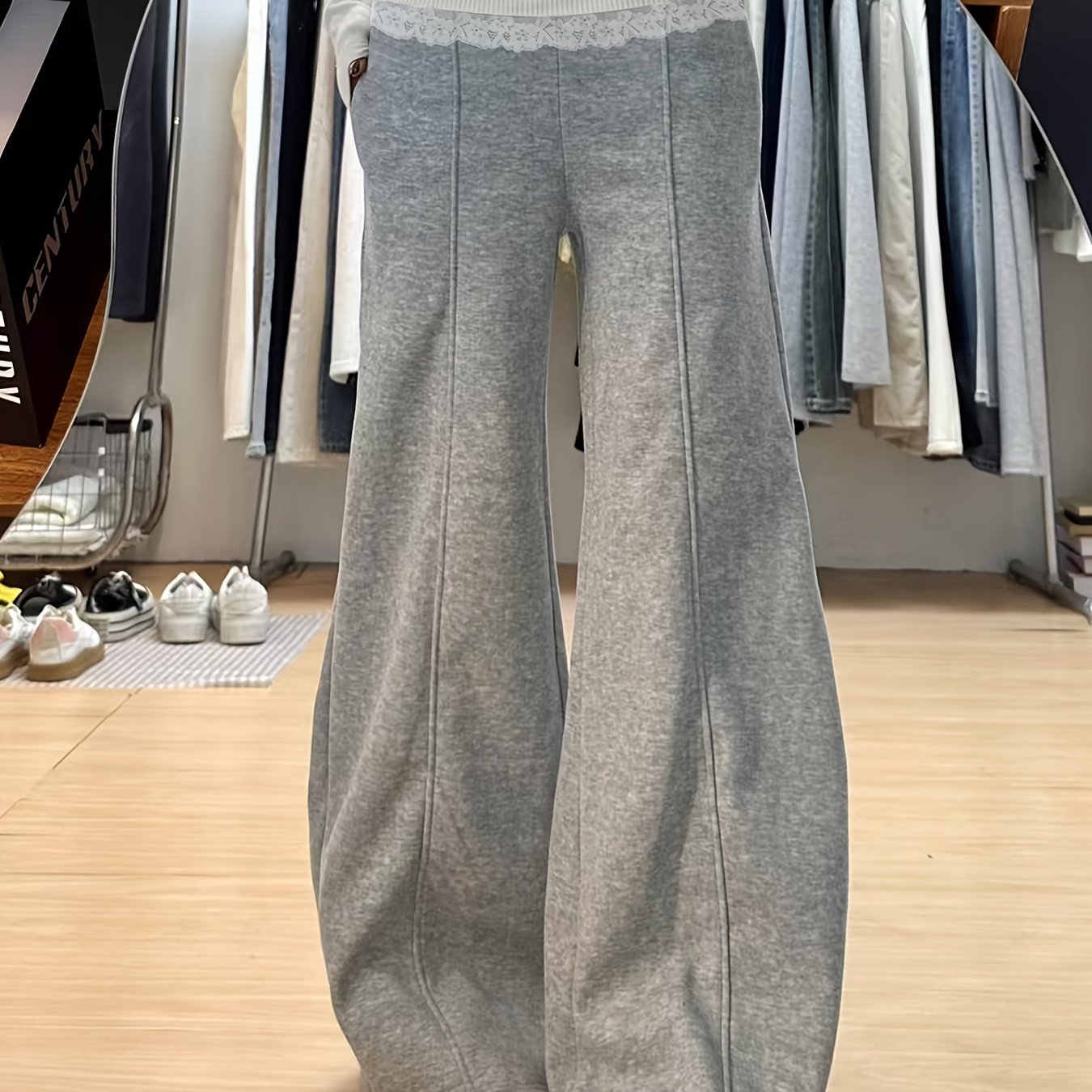TEMU 여성용 와이드 벨바텀 팬츠 - 하이웨이스트 레이스 트림 플레어 팬츠, 루즈핏 벨바텀, 세탁기 사용 가능, 사계절 캐주얼 & 드레시 아웃핏 (비침 없음)