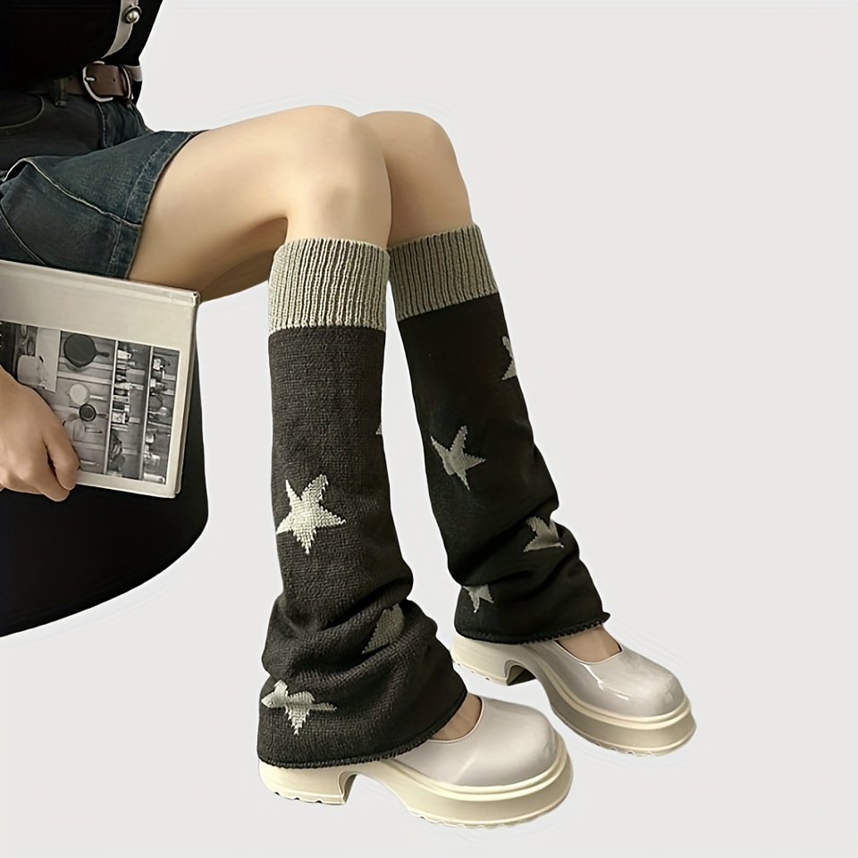 TEMU 여성용 아메리칸 레트로 스타 패턴 오버더니 소크스 - 리버서블 플레어드 레그 워머, 스택 가능한 디자인, 청바지 & 드레스 매치 가능, 기하학적 무늬, 내구성 강한 캐주얼 웨어