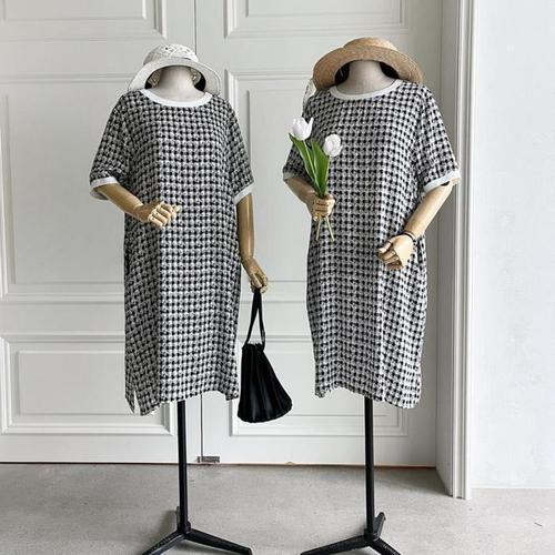 [다잇템]여자 격자 중간 트위드 반소매 휴양지룩 원피스 (10400396A)