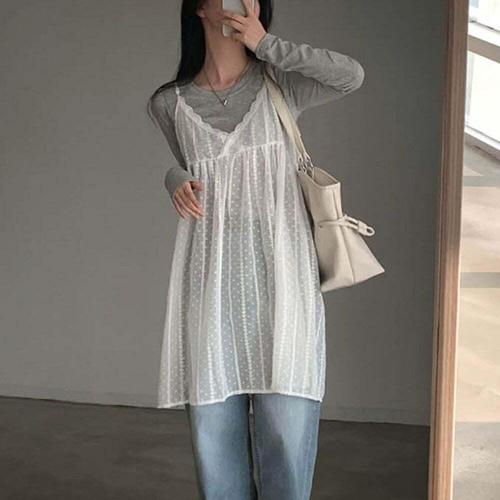[에이치플러스몰]여성 화이트 끈 원피스 시스루 루즈핏 레이어드