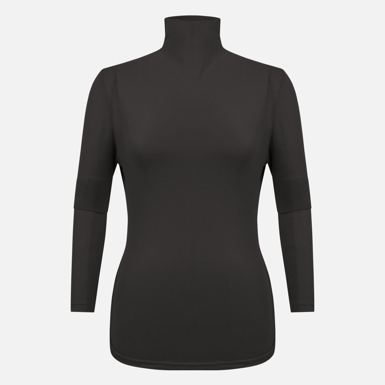 DEMOO 비대칭 컬러 배색 패널 하이넥 티셔츠 블랙