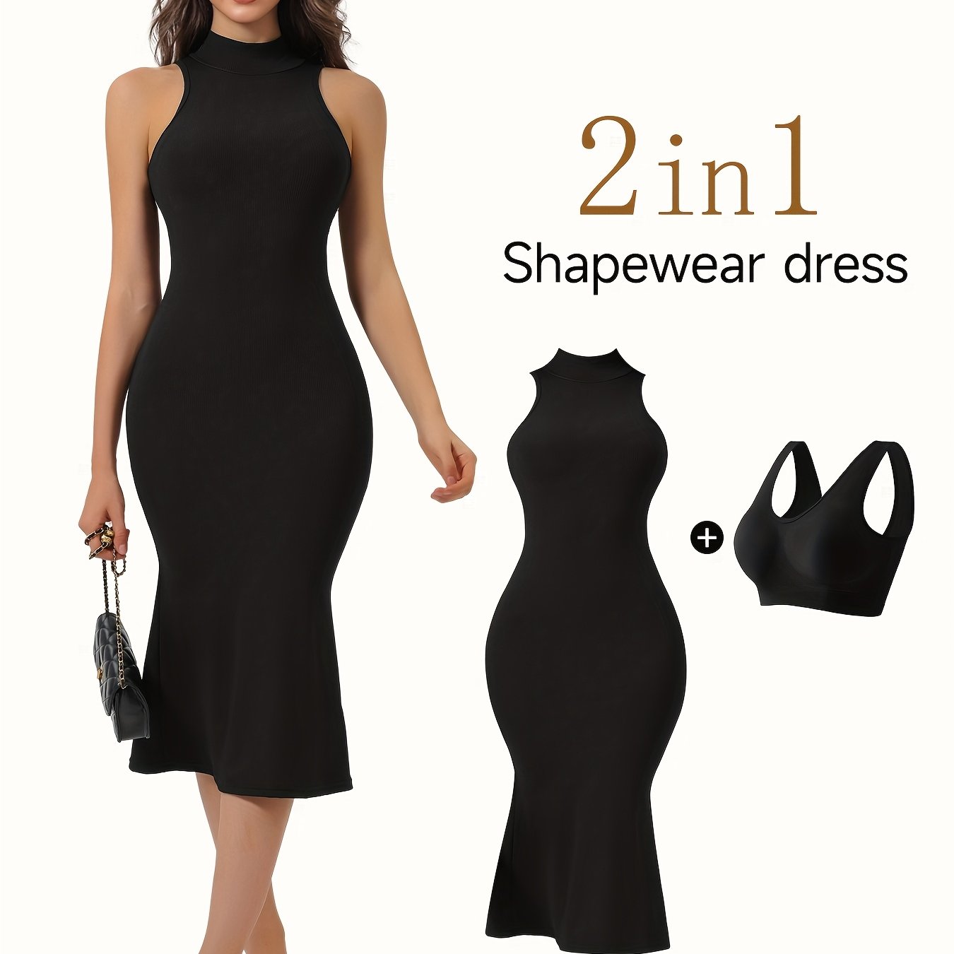 TEMU 리브 디자인과 컵 홀더가 내장된 중동을 위한 두 가지 역할을 하는 하이넥 민소매 원피스, 몸매를 부드럽게 연출하는 드레스