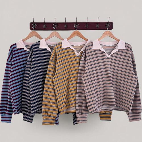 여자 오픈카라 배색 스트라이프 힙커버 티셔츠