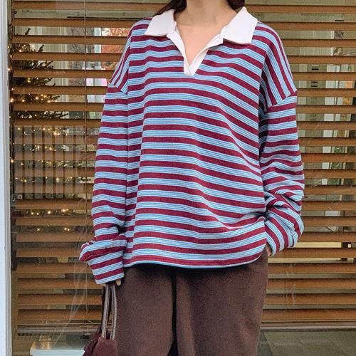 [옷자락]여자 오픈카라 배색 스트라이프 오버핏 힙커버 티셔츠