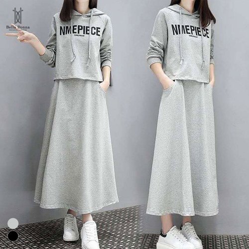 벨라도나 사계절 여성 캐주얼 후드티셔츠+A라인 롱스커트 투피스셋업 사이드주머니 Bon-2609