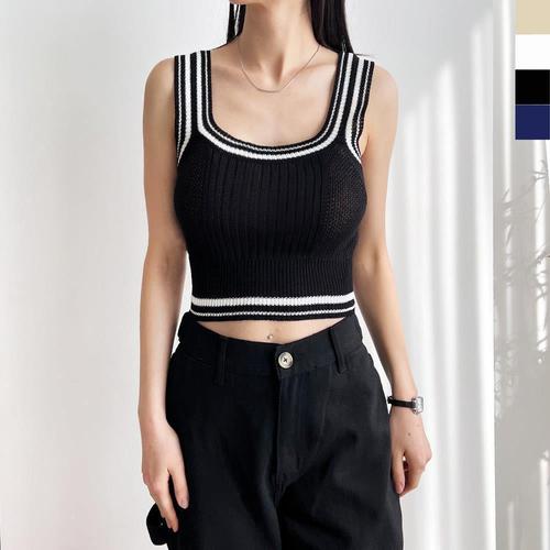 [옷자락]여성 배색 라인 뷔스티에 크롭 민소매 니트