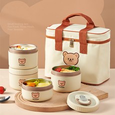 304 스테인리스 보온 도시락통 세트 귀여운 디자인 학생 직장인 대용량 원형 도시락 런치박스 전자레인지용 3단 4단 도시락통 전용 가방+수저 포함, 1세트, 4층