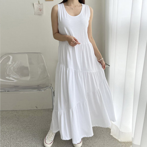여성 민소매 3단 캉캉 루즈핏 롱 원피스 NTT-WDR-20747-화이트